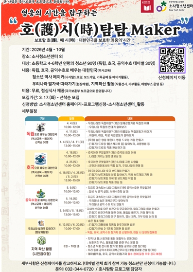 소사청소년센터는 지난해 ‘숨은 독립영웅을 찾는 History Maker’ 프로그램을 통해 청소년 눈높이에 맞춘 역사 교육과 체험활동을 운영하며 보훈 교육의 가능성을 확인한 바 있다. 이러한 운영 경험과 성과를 바탕으로 올해에는 독립·호국·공익수호의 가치를 중심으로 한 '영웅의 시간을 탐구하는 호(護)시(時)탐탐 Maker' 프로그램을 추진한다.