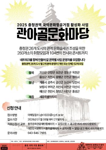 충주문화관광재단 관계자는 “5극 3특의 초광역권 성장이 국가적 과제인 지금, 충주는 대한민국 문화도시 사업을 통해 충청권 전체를 하나의 문화 생활권으로 묶는 구심점 역할을 수행하고자 한다”며, “시민 누구나 집 앞 15분 거리 안에서 국악을 즐기는 ‘충청권 문화 슬세권’을 조성하여, 광역권을 선도하는 문화 중심 도시로 도약하겠다”고 밝혔다.