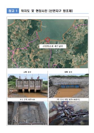 해제면 신만방조제 개보수사업은 노후 배수갑문의 성능 보완과 기능 향상을 위한 정비사업으로, 총 40억 원(국비 20억 원·도비 4억 원·군비 16억 원)이 투입된다.