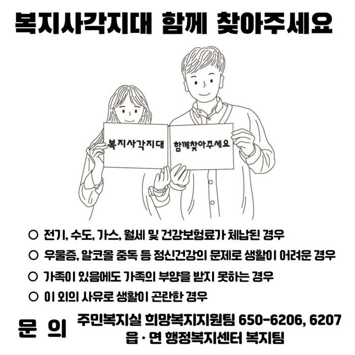 윤상준 주민복지실장은 “도움이 필요한 이웃이 있으면 반드시 읍.면 행정복지센터 복지팀 등 복지관련 부서로 알려 위기가구가 신속하게 지원받을 수 있도록 어려운 이웃을 함께 찾아주시길 바란다”고 당부했다.