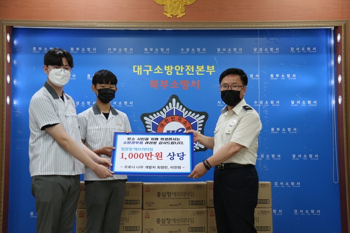 | ▲ ‘코로나나우’ 를 개발한 최형빈·이찬형 학생이 1,000만원 상당의 광고수익금을 대구소방안전본부에 전달하고 있다.(사진=대구소방안전본부 제공) |