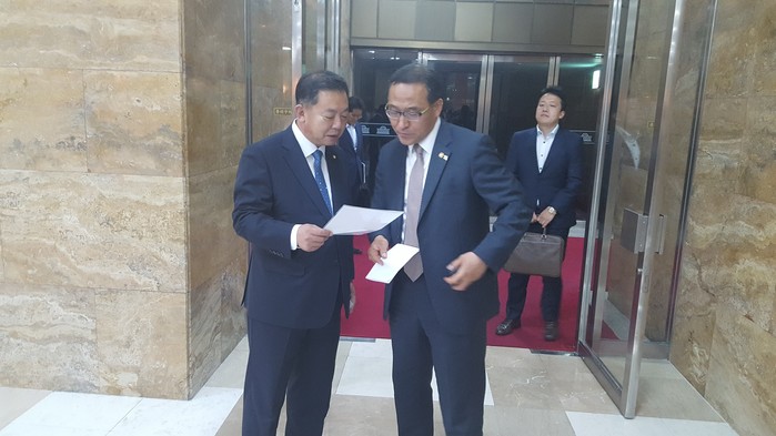 | ▲ 이찬열 국회의원(왼쪽)이 21일 국회 본청에서 홍윤식 행정자치부 장관과 '수원지방합동청사' 신축관련 이야기를 나누고 있다. <사진제공=이찬열국회의원실> |