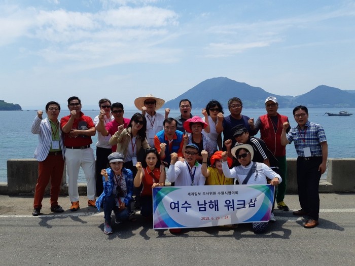 [세계로컬신문 신승욱 조사위원] 세계일보 조사위원 수원 팔달협의회(회장 신승욱)가 지난 23일, 24일 양일간 남해·여수 워크숍을 갖고 남해 바다 앞에서 기념촬영을 하고 있다.