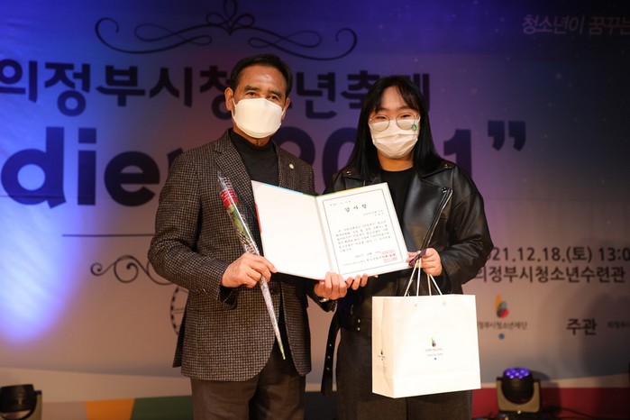 1부는 의정부시 청소년 행복 주간 운영, 진로교육 활성화 지원, 여성청소년 복지 등 의정부시 청소년을 위한 조례안을 제정한 오범구 의장, 임호석 의원, 최정희 의원에게 청소년들이 직접 감사의 마음을 담은 감사장을 전달하는 ‘의정부시 청소년 드림 어워드’로 활기차게 시작됐다.