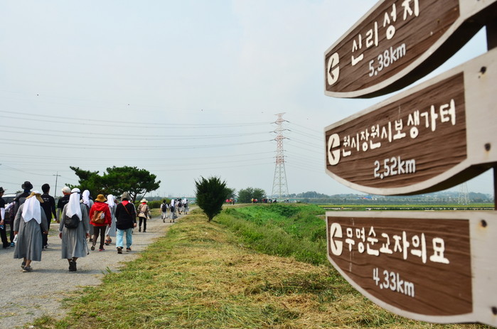 순례길은 솔뫼성지를 출발점으로 1929년 건립된 합덕성당과 지난해 세계관개시설물유산으로 등재된 합덕제를 비롯해 합덕제 중수비, 원시장·원시보 우물터, 무명순교자의 묘를 경유해 신리성지까지 이어진 13.3㎞ 코스로 이뤄져 있다.