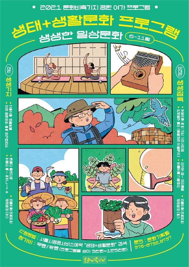 문화비축기지의 야외공간체험이 가능한 ‘생생기지’ 5개 프로그램은 목요일부터 토요일까지 요가와 명상, 텃밭 가꾸기 등으로 푸르른 공원의 자연을 만끽하며 즐길 수 있는 활동이다.