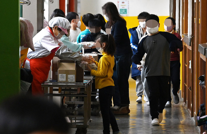 | ▲서울시내 한 초등학교 학생들이 배식받고 있다. (사진=뉴시스) |