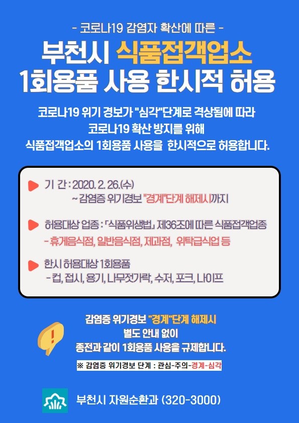 [세계로컬타임즈 장선영 기자] 부천시는 코로나19 감염증 위기경보 단계가 경계에서 ‘심각’으로 격상됨에 따라 감염증 확산방지를 위해 식품접객업소의 1회용품 사용을 한시적으로 허용한다.