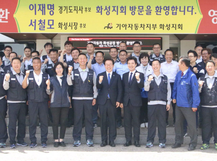 | ▲ 서철모 화성시장 후보(사진 오른쪽 네번째)와 이재명 경기도지사 후보(사진 오른쪽 다섯번째)가 24일 기아자동차 노조 화성지회를 방문하고 기념촬영을 하고 있다. |
