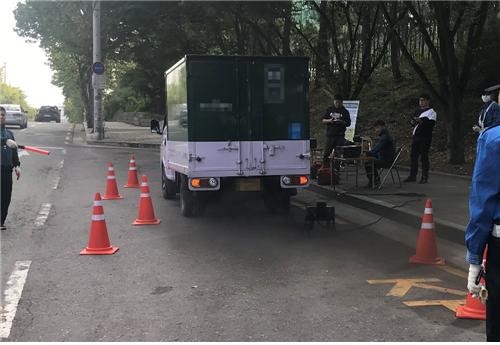 | ▲ 자동차 배출가스 점검을 하기 위해 화물차를 정차시키고 있다.(사진=경북도 제공) |