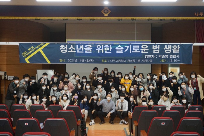 | ▲ 청소년을 위한 슬기로운 법 생활 강연 뒤 관계자들이 기념촬영을 하고 있다.(사진=나주시) |