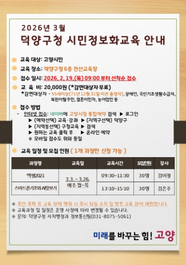 교육은 오는 3월 3일부터 26일까지 덕양구청 전산교육장에서 진행되며, 수강 신청은 이달 19일 오전 9시부터 덕양구청 누리집을 통해 가능하다.