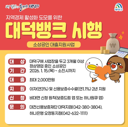 대덕구 관계자는 “이번 대덕뱅크 사업이 금융 부담으로 어려움을 겪는 지역 소상공인들에게 실질적인 도움이 되길 바란다”며 “앞으로도 지역경제에 활력을 불어넣을 수 있는 다양한 지원책을 지속적으로 마련하겠다”고 말했다.