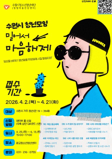 신청 기간은 오는 4월 2일부터 21일까지이며, 수원시에 거주하거나 활동하는 청년이라면 누구나 신청할 수 있다. 자세한 사항은 수원시청소년청년재단 홈페이지 또는 수원청년포털을 통해 확인할 수 있다.
