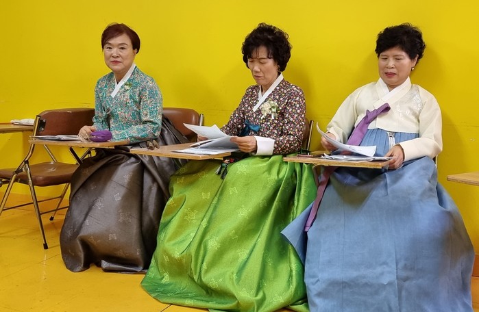 | ▲(왼쪽부터) 김도연-김길자=정재윤 전문 시낭송가가 자격 시험을 받기 위해 대기하고 있다. |
