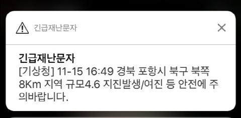 | ▲ 15일 오후 4시 49분 포항일대에서 지진 발생 후 기상청에서 전송한 긴급재난문자. |