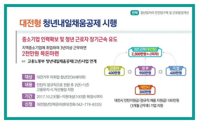 이 사업은 만 34세 이하 청년이 대전의 중소·중견기업에 인턴으로 들어가서 정규직 신분으로 3년 근무하면 2000만원의 목돈을 지급하는 것을 골자로 하고 있다.