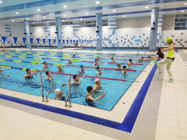 수중운동교실은 전문 강사가 물속에서 기구를 이용한 관절 자조운동과 체조, 율동 등을 통해 통증을 다스리고 근력과 지구력을 향상시켜 유연성 회복은 물론 경직된 근육을 풀어 근력 강화를 돕는다
