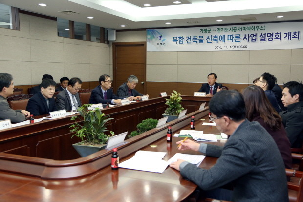 가평군은 17일 군청 소회의실에서 김성기 군수와 차영호 따복주택부추진단장, 군청 및 경기도시공사 사업추진 담당직원 등이 참석한 가운데 ‘복합건축물 및 따복하우스’ 신축을 위한 사업설명회를 가졌다고 밝혔다.