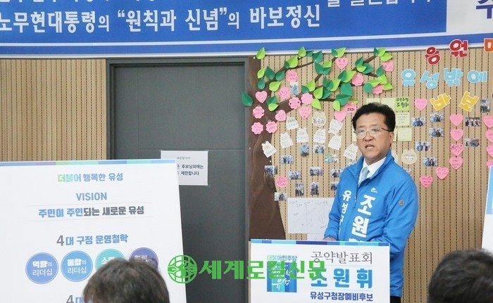 | ▲ 조원휘 더불어민주당 대전 유성구청장 예비후보가 10일 오후 장대동 선거사무소에서 공약발표하는 모습. |