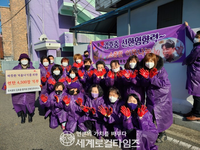[세계로컬타임즈 조주연 기자] 트로트 가수 김호중 씨의 팬클럽 '전북전주아리스' 회원들이 28일 취약계층을 위해 써달라며 전주시에 연탄 4500장을 기부했다.