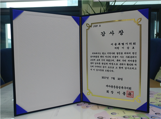 | ▲ 이승로 서울시의원이 받은 새마을운동 성북구지회 감사장. <사진제공=서울시의회> |