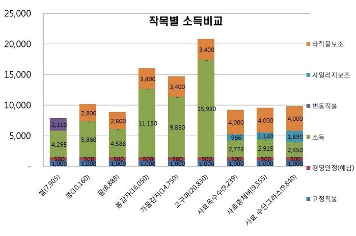 한편 각종 지원사업 등을 합산한 작목별 소득비교에 따르면 ha당 벼 790만 5000원, 콩 1016만원, 총체옥수수 955만 5000원, 수단그라스 984만원 등으로 나타났다.