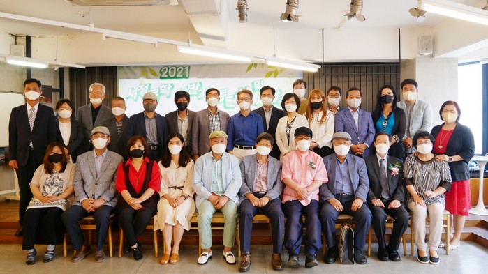 ▲6월 19일 오후 서울 종로구 대왕빌딩 NUGUNA 홀에서 열린 ‘서정문학 2021 상반기 등단식 및 시상식’에서 참가자둘이 기념사진을 찍고 있다.