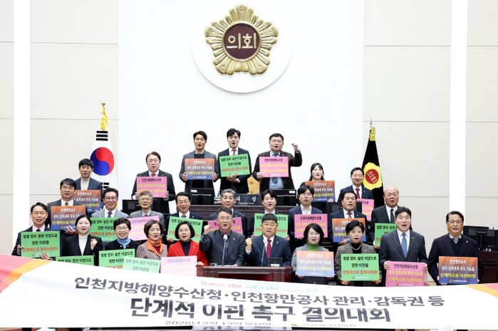 인천시의회는 12일 ‘제306회 임시회’ 폐회 후 결의대회를 열고, ‘인천지방해양수산청 및 인천항만공사 관리·감독권 등의 단계적 이관 촉구 결의안’과 관련한 성명서를 낭독했다.