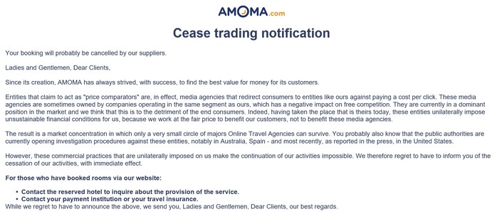 아모마닷컴은 스위스 소재 해외 숙박예약 대행업체로 지난 2016년 한국에서 서비스를 시작했다. 그러나 지난 14일, 대기업의 상업적 관행으로 자유경쟁에서 밀려 서비스 중단을 결정했다는 내용을 골자로 한 메일을 회원과 예약자에게 보내며 폐업 사실을 통보했다.