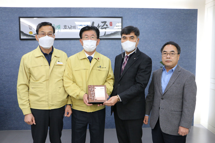 | ▲한국농어촌공사 나주지사가 나주시에 감사패를 전달하고 있다.(사진=나주시) |