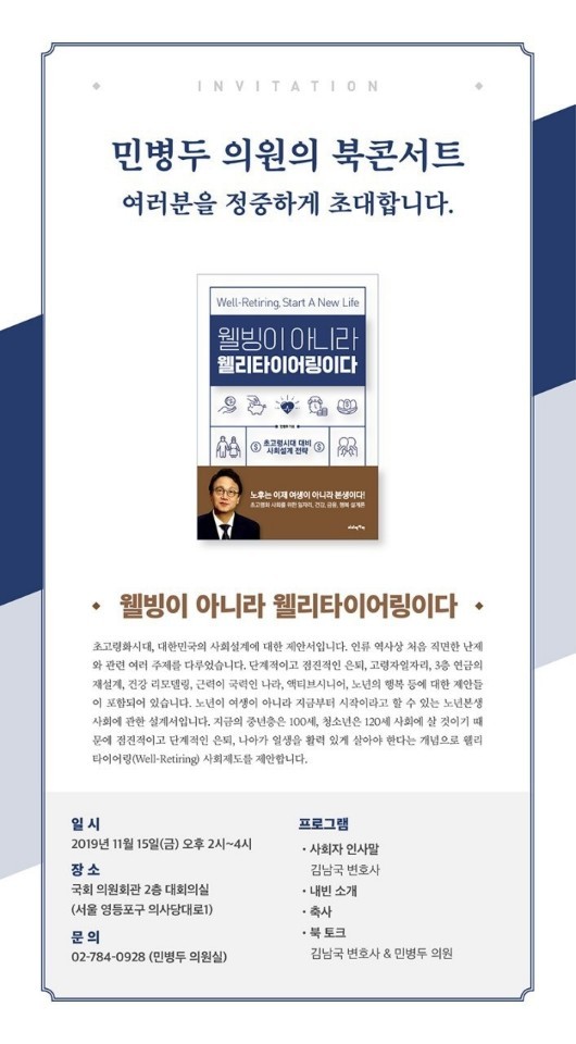단계적이고 점진적인 은퇴, 고령자일자리, 3층 연금의 재설계 ,건강리모델링, 근력이 국력인 나라, 액티브시니어, 노년의 행복 등에 대한 제안들이 포함돼 있는 민병두 의원의 신간 ‘웰빙이 아니라 웰리타이어링이다’ 출간 기념으로 북콘서트를 개최한다.