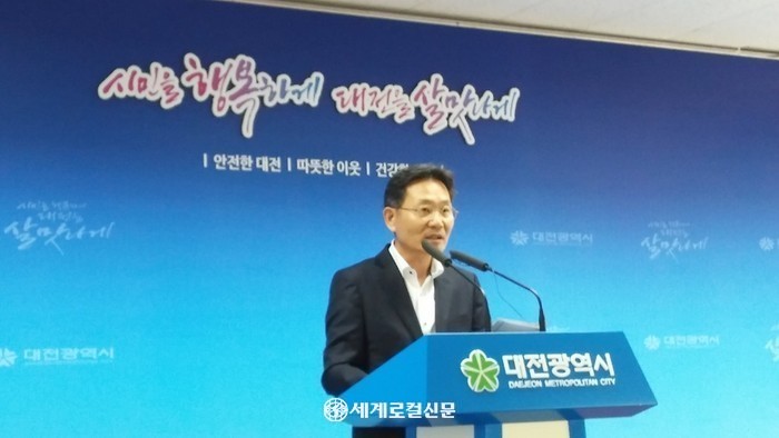 | ▲ 유승병 대전시 환경녹지국장이 26일 시청 브리핑룸에서 긴급 기자브리핑 통해 월평공원 개발안 관련 제3차 대전시 도시공원위원회 결과를 발표하고 있다.<사진= 오영균 기자> |