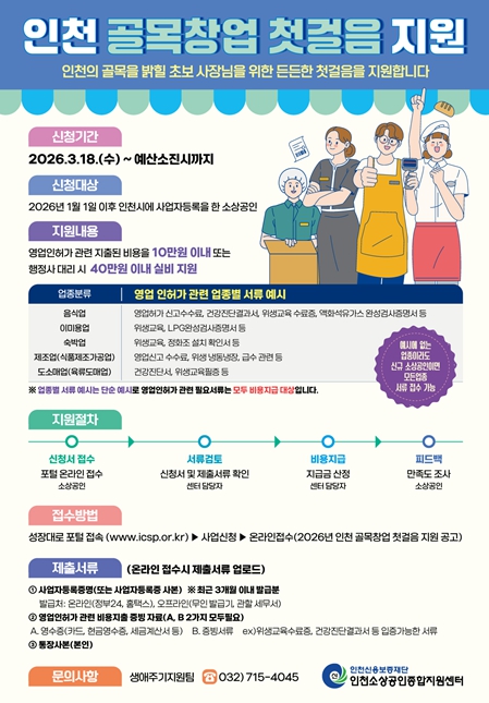 사업 수행은 센터가 담당하며, 신청 방법과 세부 일정 등 관련 사항은 성장대로 포털 및 인천소상공인종합지원센터 홈페이지를 통해 확인할 수 있다.