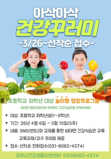 참여 신청은 오는 3월 26일부터 양주시 건강생활지원센터를 통해 전화로 접수할 수 있다. 대상은 관내 초등학교 저학년 학생이며, 선착순으로 모집이 진행돼 조기 마감될 수 있다.