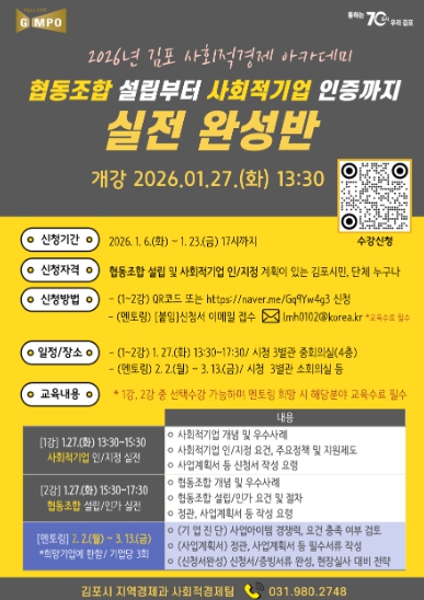 이번 아카데미는 평소 사회적경제에 관심 있는 김포시민은 물론, 연내 사회적기업, 협동조합 설립을 준비 중인 관내 기업 및 단체라면 누구나 신청할 수 있다.