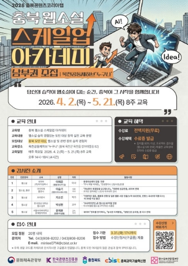 참여 대상은 웹소설 및 관련 장르에 관심이 있거나 습작 경험이 있는 충북 도민으로 교육과정은 ▲기초 설계 ▲초반 집필 ▲중반 전개 ▲리뷰 및 발표의 4단계로 구성되며, 수강생들은 최종적으로 5회차 분량의 웹소설 원고를 완성하게 된다.