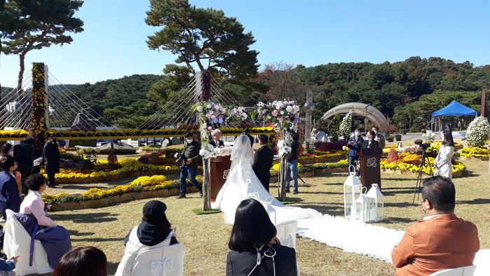특히, 이날 잔디광장에서 국화전시회가 함께 열렸는데 국화로 꾸민 서해대교 조형물 앞에서 진행된 작은 결혼식의 아름다움에 시민들의 많은 감탄을 자아냈다.