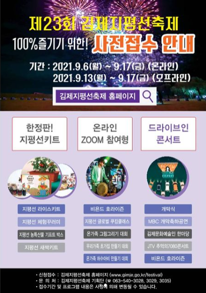 온라인 콘테스트와 지평선 글로벌 쿠킹클래스 등도 김제지평선축제 홈페이지에서 사전접수를 받는다.