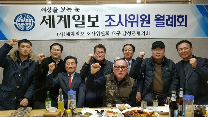 ▲ 세계일보 조사위원 대구시 달성군협의회 회원들이 11일 황태명가 식당에서 월례회의를 열면서 단체로 기념촬영하고 있다. |