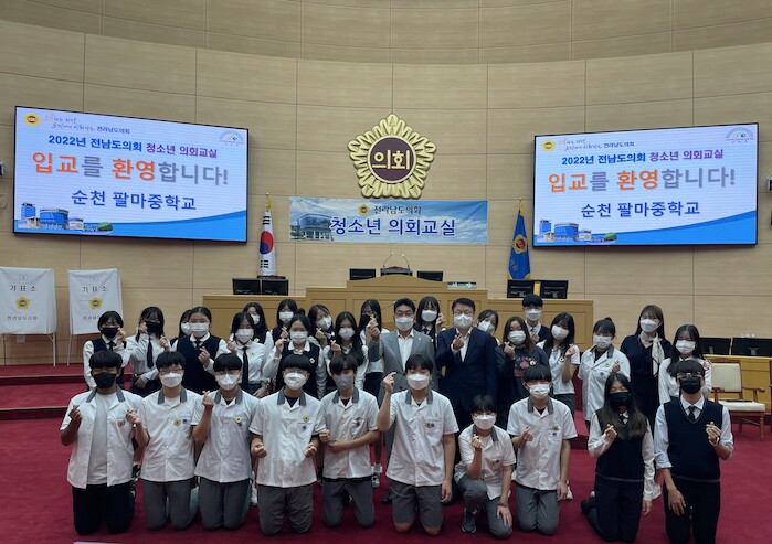지난 2일에는 순천팔마중학교 2.3학년 학생 29명이 참여해 지역구 의원인 김정이 도의원과의 만남을 시작으로 ‘의장 선거’와 ‘학생 교복 자율화 조례 제정안’에 대한 찬반토론.표결처리 등 본회의와 동일하게 의사진행을 실시했다.