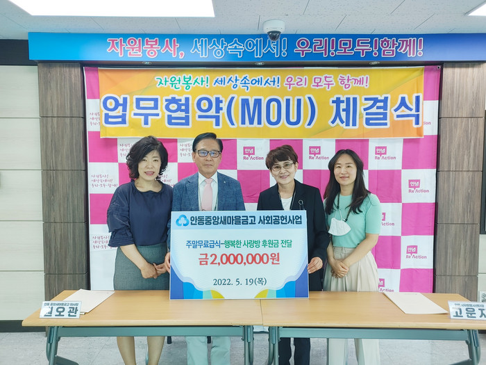 [세계로컬타임즈 이장학 기자] 안동시자원봉사센터는 중앙새마을금고와 ‘주말급식-행복한 사랑방’ 후원금 전달 및 지역상생을 위한 업무협약을 체결(19일)했다고 20일 밝혔다.
