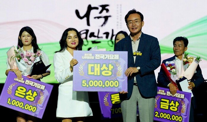 윤병태 시장(오른쪽)이 ‘제17회 나주 영산강 전국 가요제’에서 대상을 수상한 장성희 씨에게 상금 500만 원을 전달하고 기념사진을 찍고 있다.[세계로컬타임즈] ‘2025 나주영산강축제’ 국민참여 프로그램중 하나인 ‘제17회 나주 영산강 전국 가요제’에서 천년학(김용림)을 열창한 장성희 씨(광주광역시)가 영예의 대상을 차지해 부상으로 상금 500만 원을 수여 받았다.