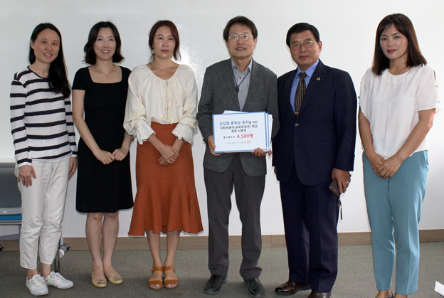 | ▲ 지난 17일 김춘수 서울시의원(오른쪽 두번째)이 신길동중학교유치위원회 학부모들과 함께 조희연 서울시교육감(오른쪽 세번째)를 찾아 신길중학교(가칭) 신설에 대한 지원을 요청하고 기념촬영을 하고 있다. <사진제공=서울시의회> |