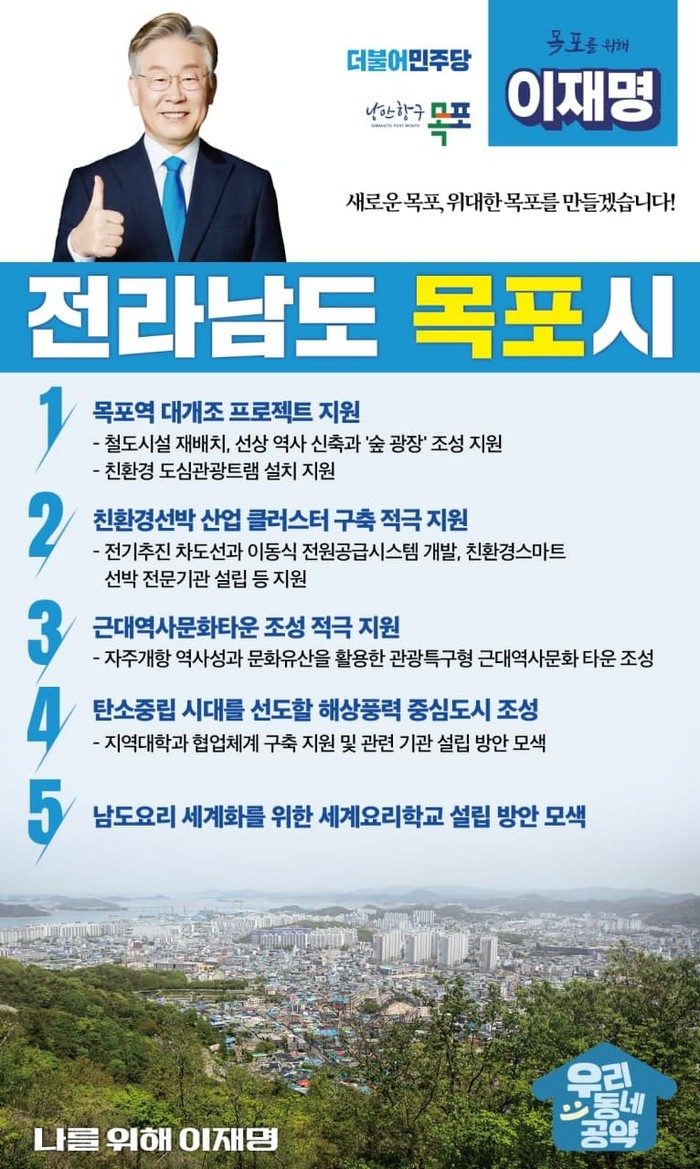 이재명 대통령후보의 온라인 플랫폼‘재명이네 마을’ 홈페이지를 통해 공개된 목포시 지역공약은 총 5가지로, 더불어민주당 김원이 의원(목포시)의 총선공약이 대거 포함됐다.