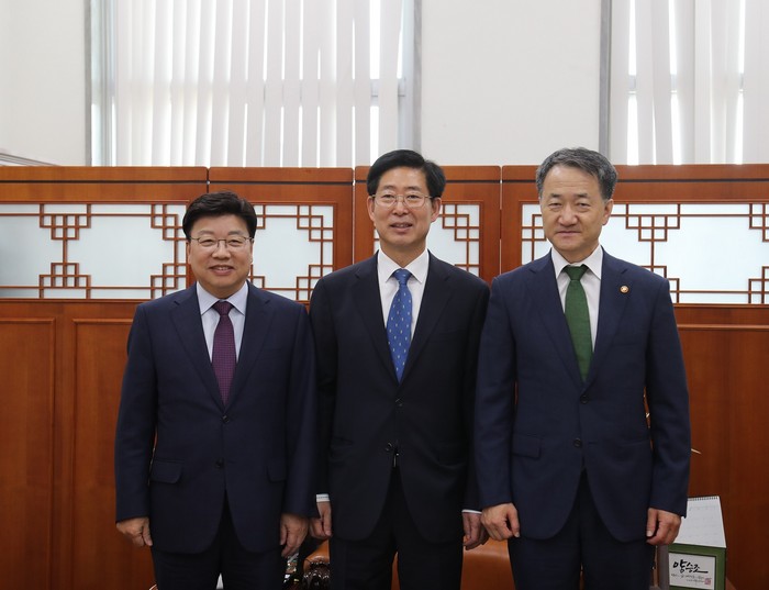 | ▲(왼쪽부터) 권선택 대전시장, 양승조 보건복지위원장, 박능후 보건복지부장관은 국회 보건복지위원장실에서 대전의료원 및 국립어린이재활병원 건립 의견을 나누고 기념촬영을 하고 있다. <사진제공=대전시청> |