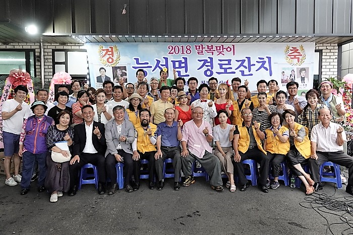 | ▲ 18일 경기도 여주시 능서면 소재 (주)대윤건설 사옥 앞에서 열린 '2018 말복맞이 능서면 경로잔치'에 참석한 (사)한국희망연맹중앙회 윤진형 회장과 주민, 참가자들이 기념촬영을 하고 있다. |