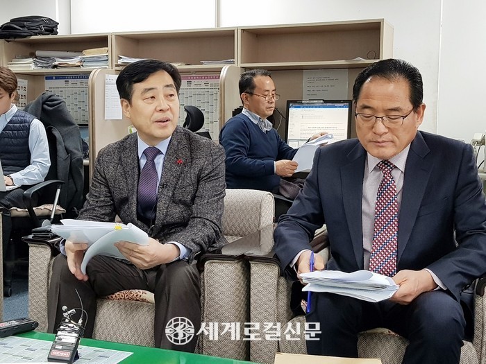 | ▲ 유영균 대전도시공사 사장(왼쪽)와 백명흠 사업이사가 대전시청 기자실을 방문해 유성복합터미널 조성사업의 우선협상대상자로 선정된 하주실업과 관련된 의혹 등에 대해 해명하고 있다. |