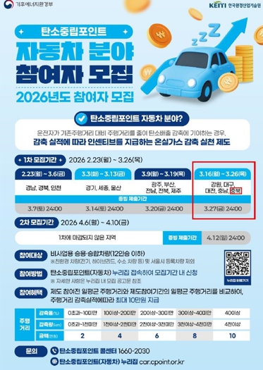 올해 모집 규모는 총 2,267대이며, 3월 16일부터 26일까지 선착순으로 접수한다. 참여를 희망하는 시민은 해당 기간에 탄소중립포인트(자동차) 누리집에 접속해 직접 회원가입 후 신청하면 된다.