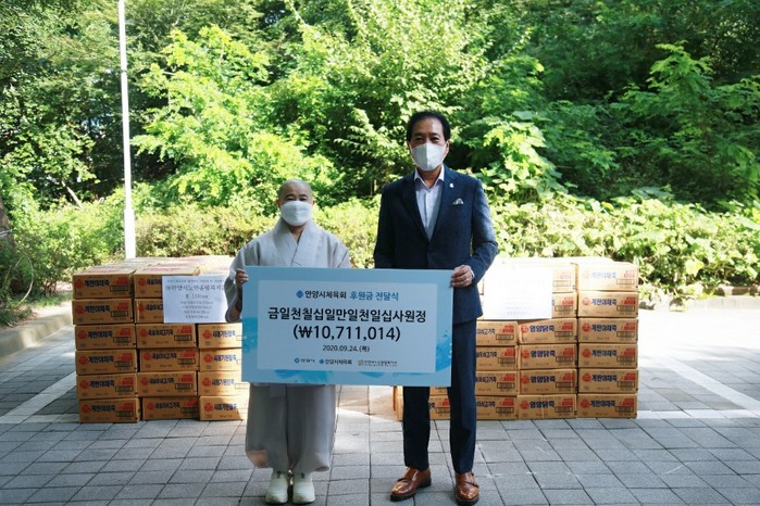 ▲박귀종(오른쪽) 안양시체육회장과 안양시노인복지회관장 혜철스님이 구호물품 전달식 후 기념촬영을 하고 있다. (사진=안양시체육회 제공) |